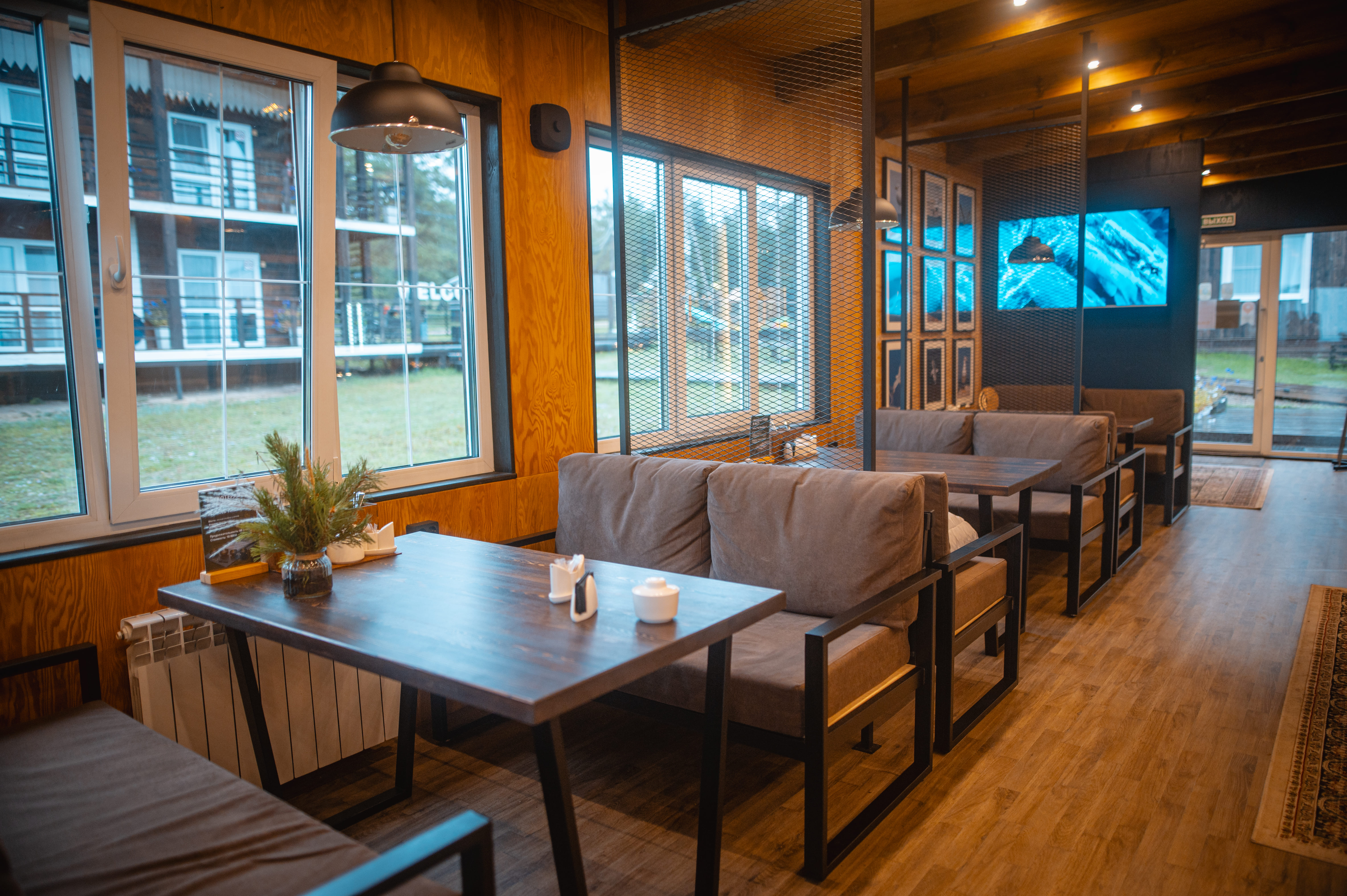 Ресторан предлагает банкетное и фуршетное меню с байкальскими продуктами — омуль, хариус, сибирские ягоды и травы