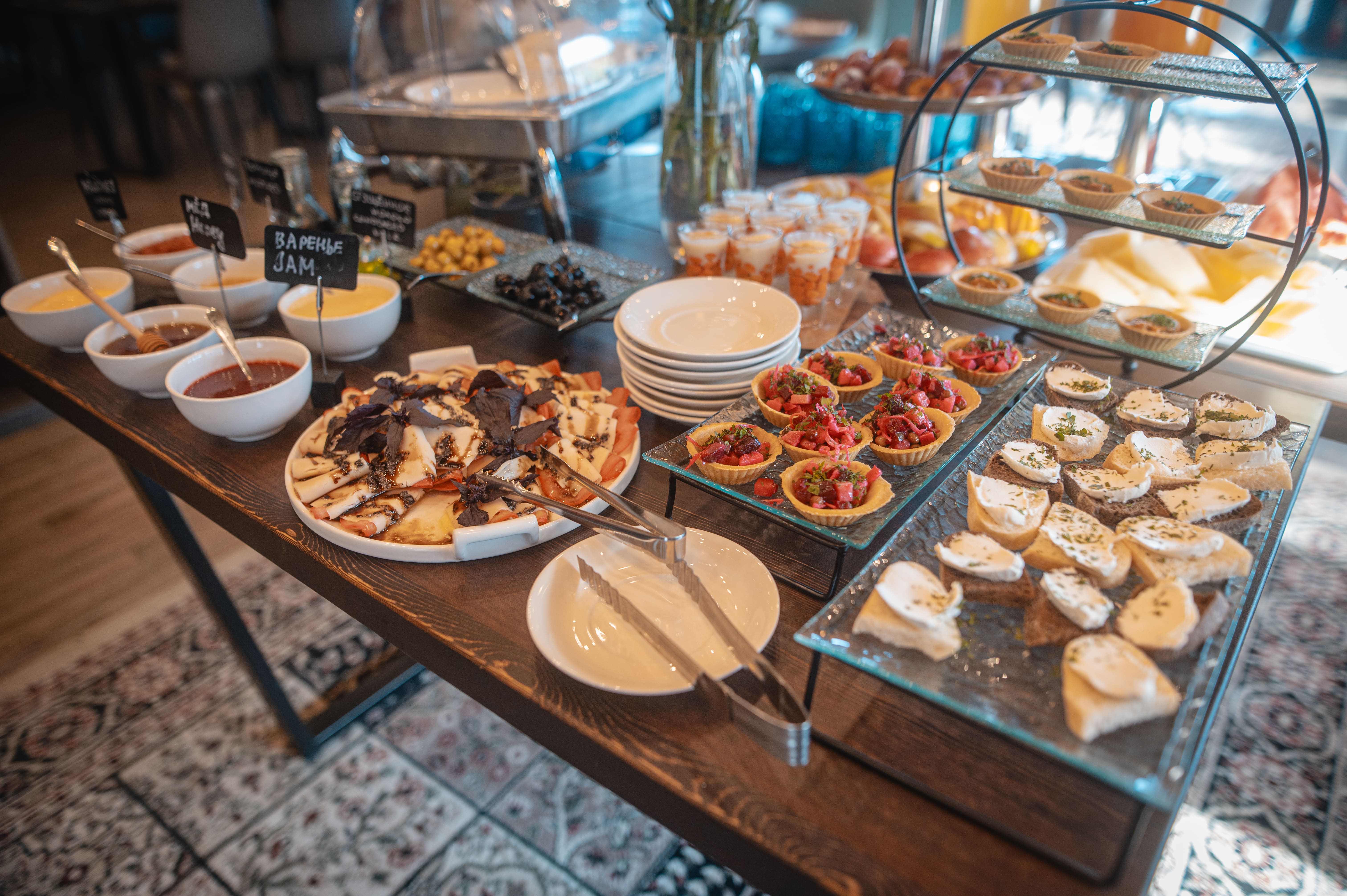 Шведская линия и a la carte: много вариаций яиц, вкусные каши, свежие овощи и фрукты, мясо и рыба, напитки, десерты и выпечка